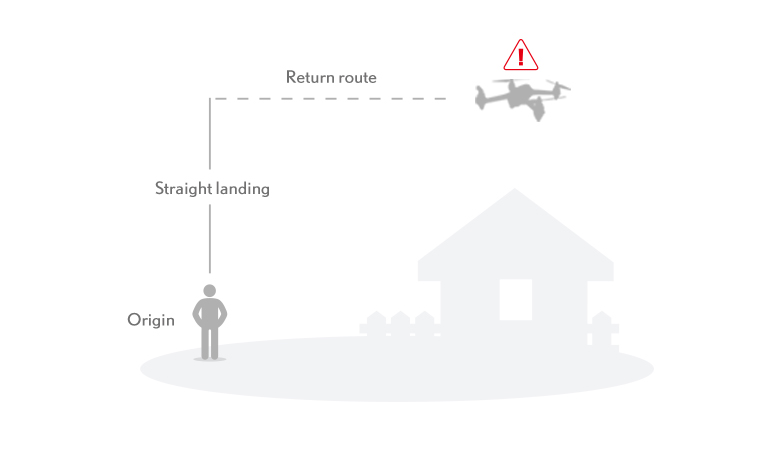 When the aircraft's rear lights flash red slowly, battery icon “ ” is shown on the LCD screen, and steady beep.., beep..., beep sound is heard. At this moment, as long as the aircraft flying altitude is over 15 meters or the flying distance is over 15 meters, the aircraft will automatically fly back to the Home Point. If the aircraft flying altitude is less than 15 meters or the flying distance is less than 15 meters, the aircraft will automatically land to the ground.